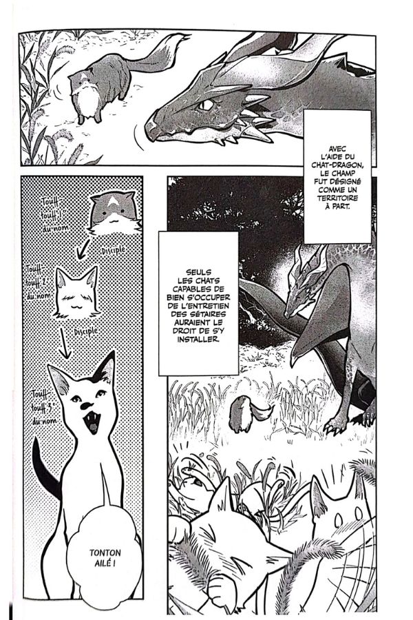 value<p>Cats and Dragons est un manga qui amène de la douceur à travers son lien entre le Dragon et les chatons qu’il élève, tout comme la Cait Sith s’occupe de la Magicienne qui l’a invoquée. Le côté slice of life est très présent, on suit les pérégrinations de générations complètes de chats à travers le temps, dans un univers rempli de Magie.</p>
